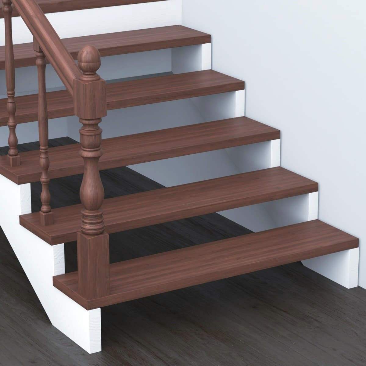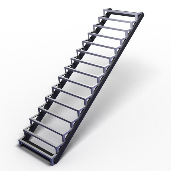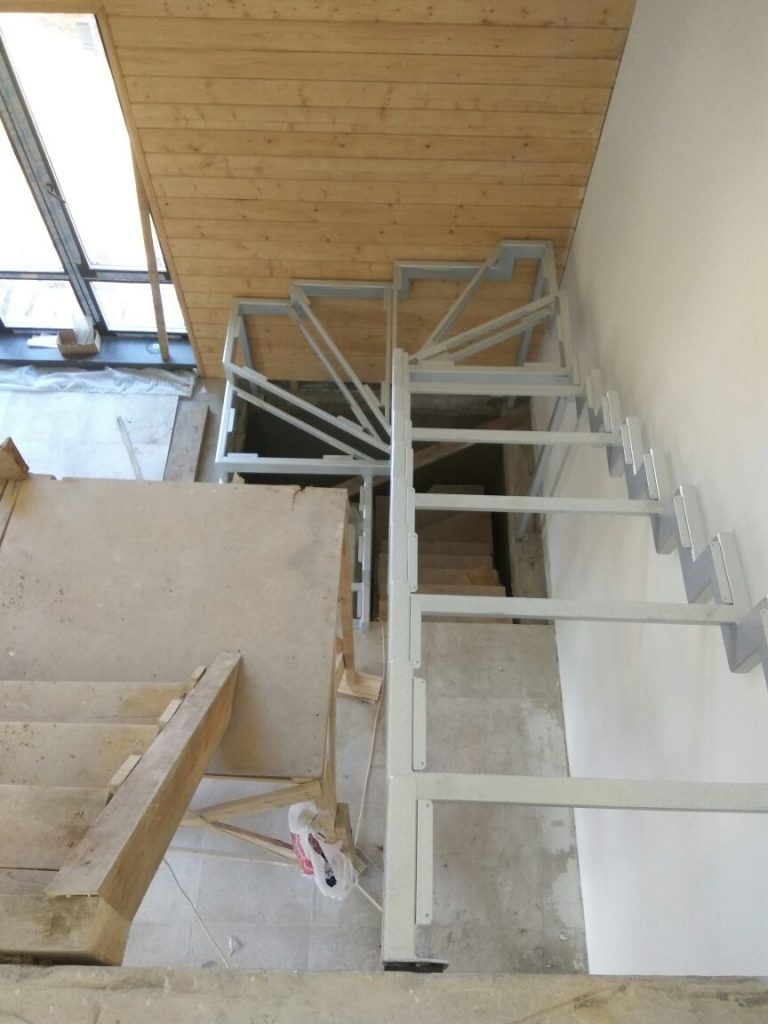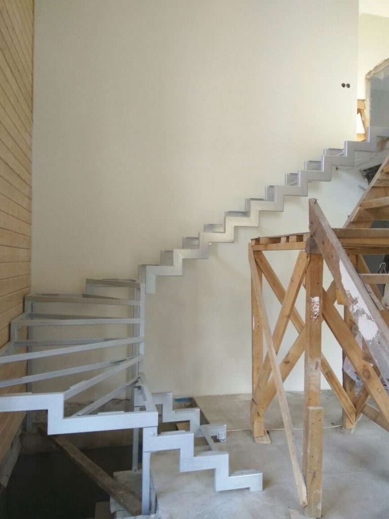 Преимущества каркасов лестниц открытого типа в том, что дальнейшая отделка требует лишь установки ступеней и ограждения, избавляя заказчика от подступенков, плинтуса пристенного, зашивки низа и торца лестницы. Чаще всего, в нашей практике, основанием для лестниц такого типа служит двойной ломаный косоур.