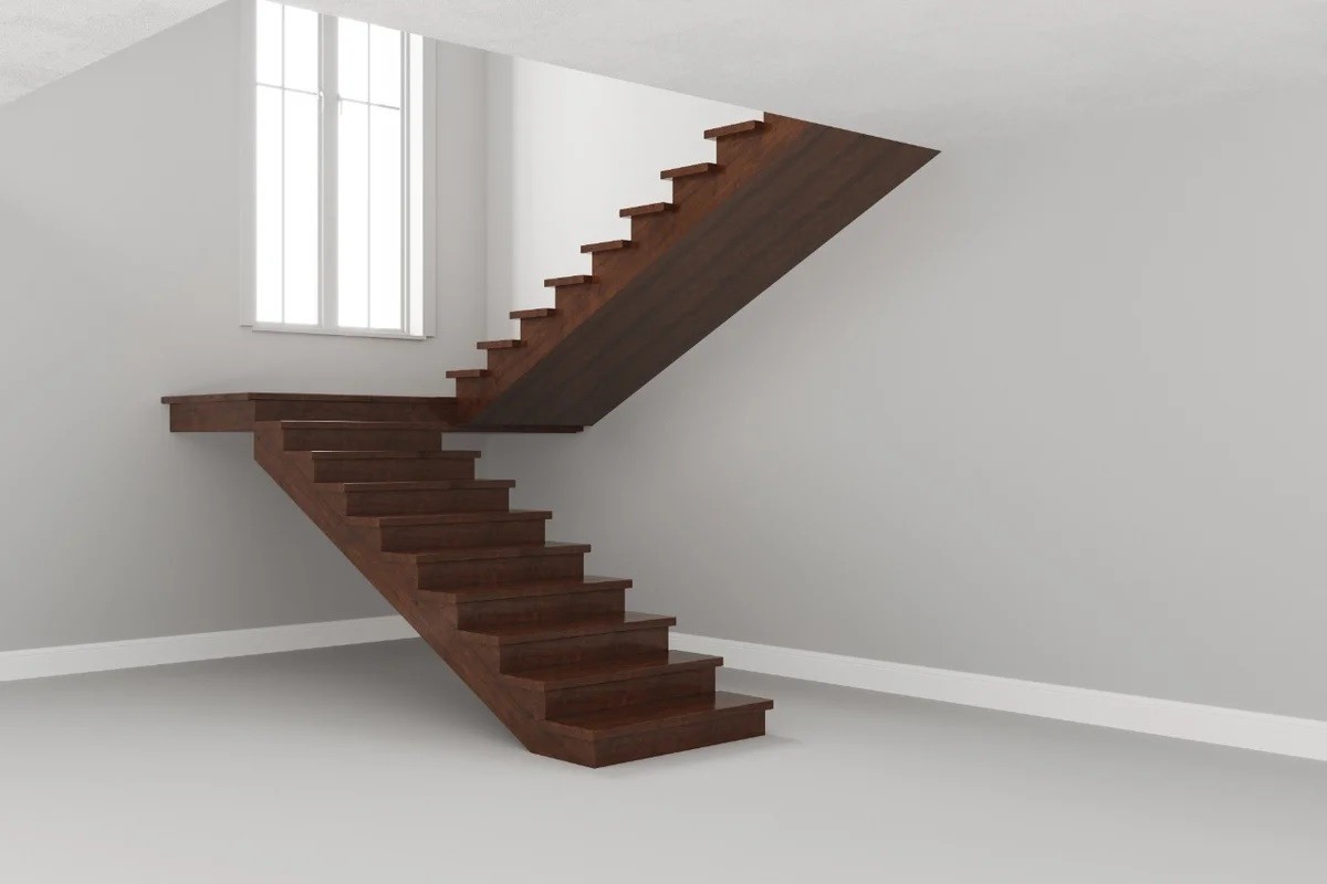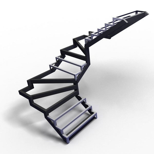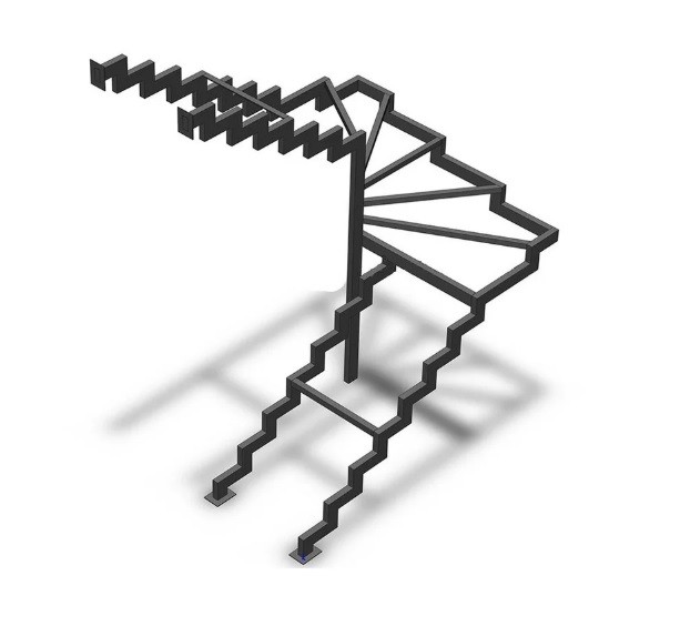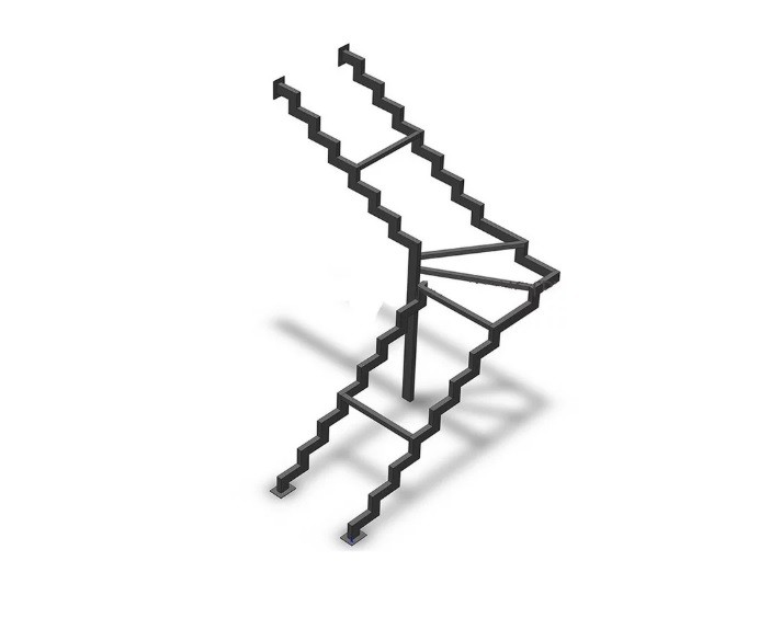 Г-образный каркас лестницы на двойном ломаном косоуре с забежными ступенями, разворот на 90°